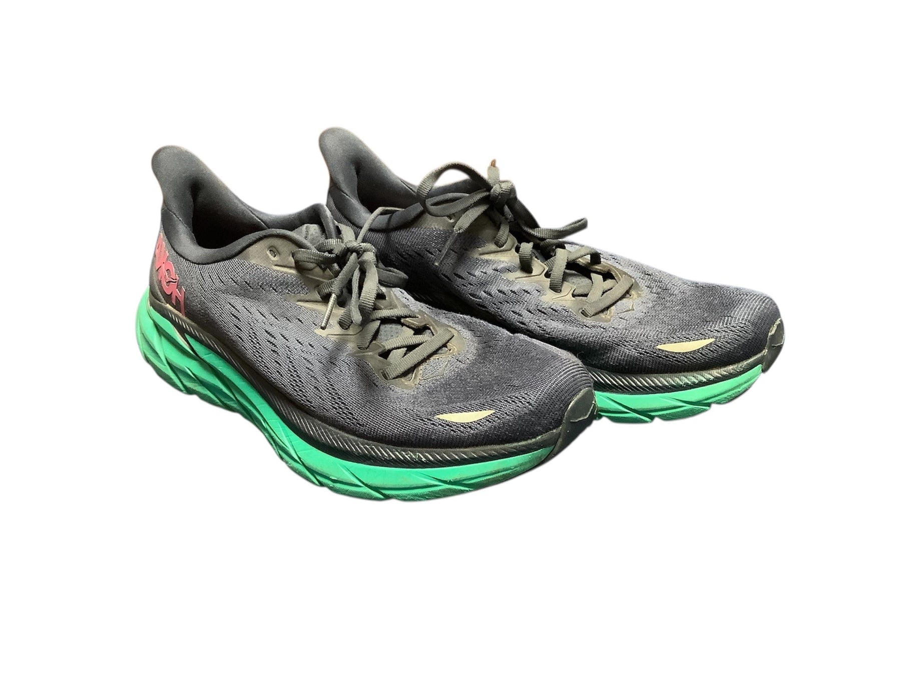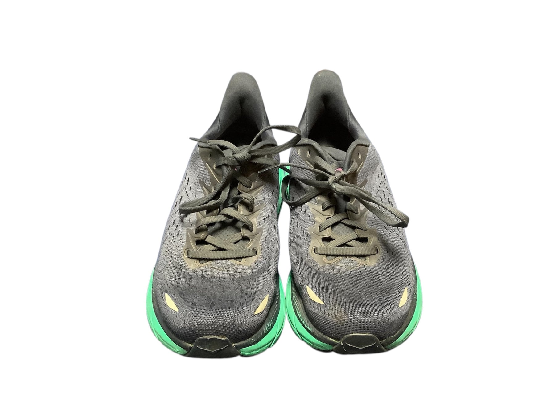 These Hoka running shoes feature a sleek gray synthetic upper with lime green accents on the midsole and outsole. Designed for long-distance comfort, they combine advanced cushioning with a lightweight build. The textured sole provides excellent grip and durability for varied terrains. Perfect for runners seeking support and style, these sneakers deliver both performance and a modern look.