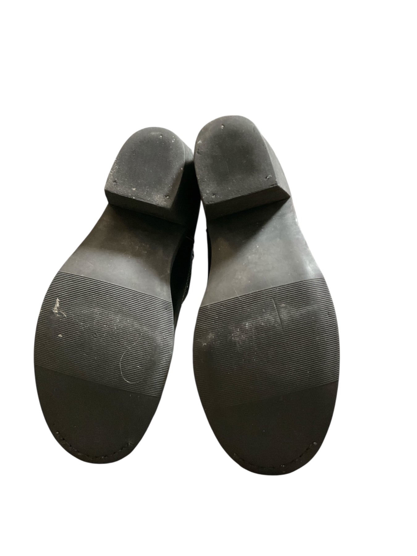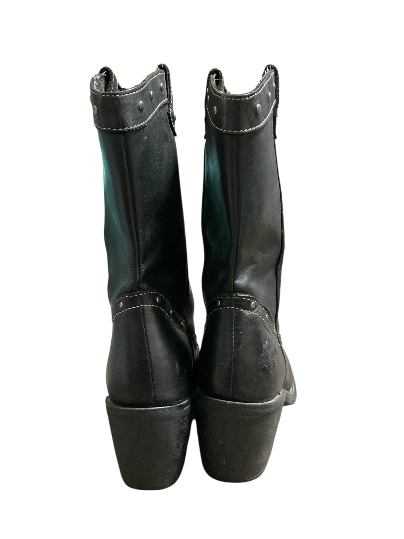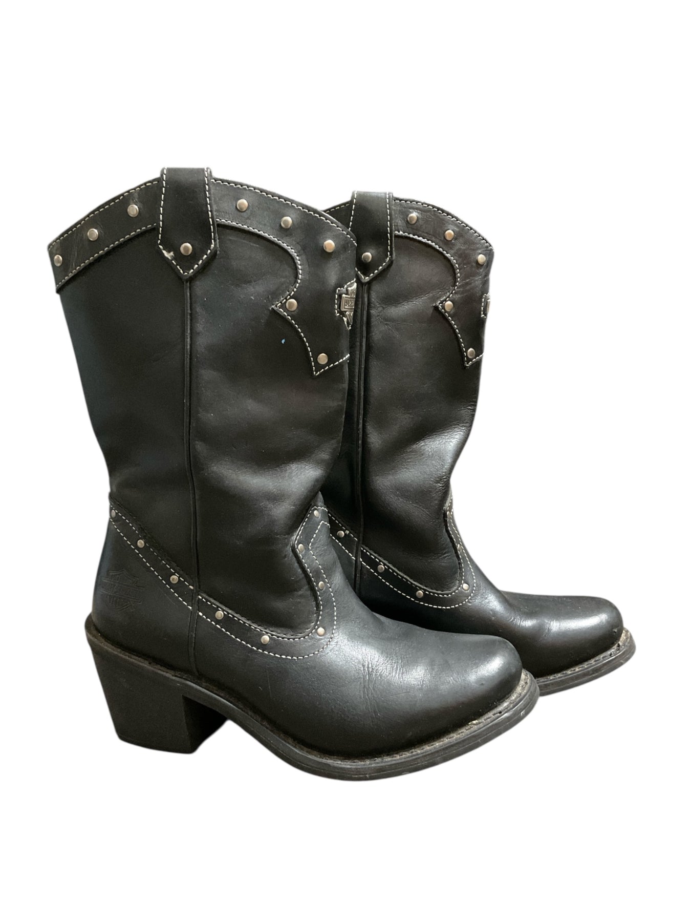 These vintage black leather Harley-Davidson women's boots feature a rugged design with detailed stitching and metal studs. Crafted for durability and style, they showcase the iconic Harley logo on the upper part. The boots have a sturdy thick heel ideal for casual or motorcycle outfit pairing. Well-worn yet still functional, they offer a timeless appeal for motorcycle enthusiasts and fashion lovers alike.